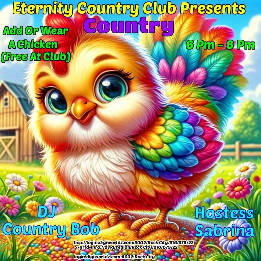 DJ Country Bob and Hostess Sabrina at the Eternity COUNTRY Venue!Rock City in 7 days | 2025-10-23 18:00 SLT*6-8PM OST Grid Time! - Ready For Some Fun? Join Us! - THEME: Add a Chicken (FREE) - Music: Country - Bull Rides for a Prize - *GUARANTEED A GOOD TIME, CYA THERE!