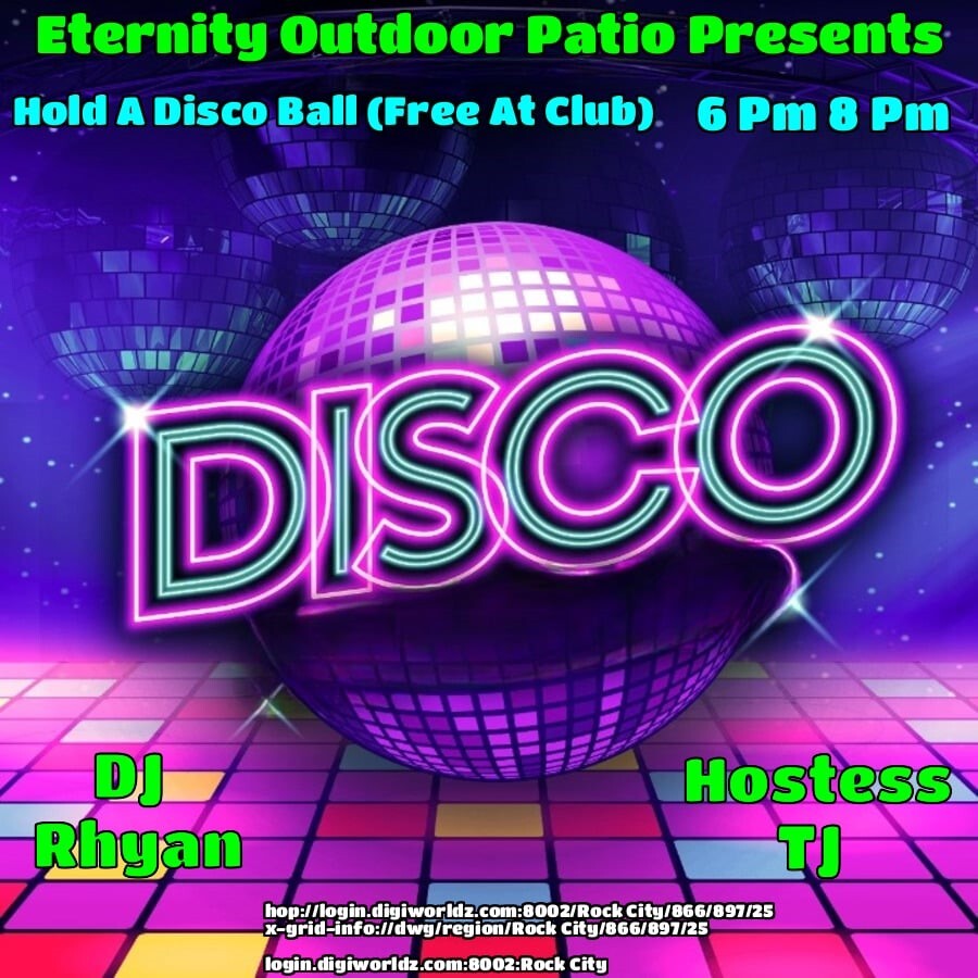 DJ Rhyan Creed and Hostess Sabrina Dementros at the Eternity PATIO Venue!Rock City in 8 days | 2025-10-24 18:00 SLT*6-8PM OST Grid Time! - Ready For Some Fun? Join Us! - THEME: Hold a Disco Ball - MUSIC: Disco - *GUARANTEED A GOOD TIME, CYA THERE!