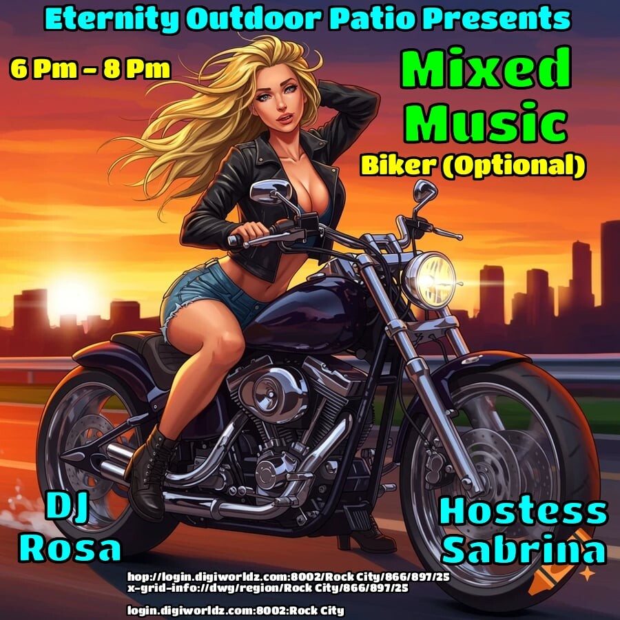 DJ Rosa Alekseev and Hostess Sabrina Dementros at the Eternity Night Club PATIO Venue!Rock City in 3 days | 2026-03-16 08:51 SLT*6-8PM OST Grid Time - *Ready For Some Fun? Join Us! - THEME: BIKER - MUSIC: Mixed - *GUARANTEED A GOOD TIME, CYA THERE!