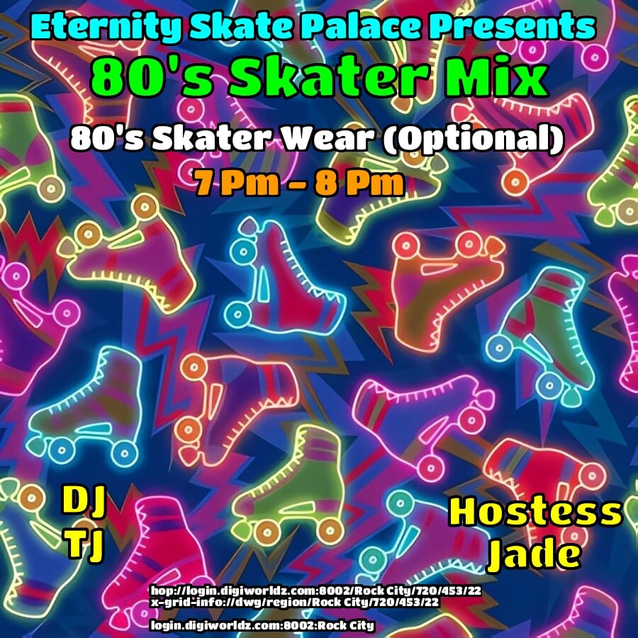 DJ TJ Mason & Hostess Jade Soraya at the Eternity Night Club - SKATE PALACE Venue!Rock City in 5 days | 2026-03-18 19:00 SLT*7-8PM OST Grid Time* - *Ready For Some Fun? Join Us! - THEME: 80s Skater Wear - MUSIC: 80s Skater Mix - Raffle by 2 Hour Rafffle By Cosplay Universe - HG Friendly! *GUARANTEED A GOOD TIME, CYA THERE!