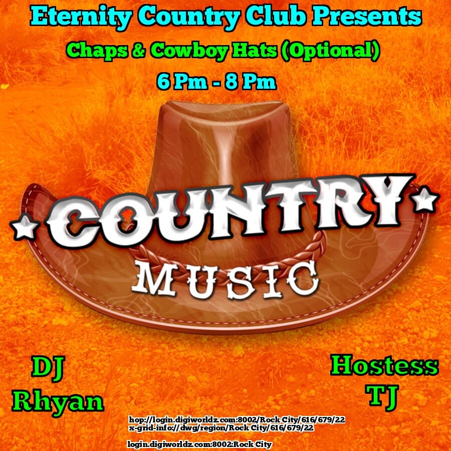 DJ Rhyan Creed and Hostess TJ Mason at the Eternity COUNTRY Venue!Rock City in 7 days | 2026-03-20 18:00 SLT*6-8PM OST Grid Time! - Ready For Some Fun? Join Us! - THEME: Chaps & Cowboy Hat - MUSIC: Country - Bull rides for a Prize *GUARANTEED A GOOD TIME, CYA THERE!