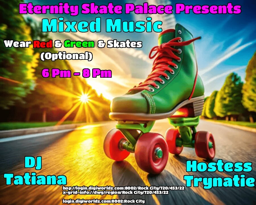 DJ Tatiana And Hostess Trynatie at the Eternity SKATE PALACE Venue!Rock City 28 days ago | 2025-12-02 18:00 SLT*6-8PM OST Grid Time* Ready for Some Fun? Join Us! THEME: WEAR RED WITH GREEN SKATES! *MUSIC: MIXED! * RAFFLE: FLASH COSTUME by Cosplay Universe - Artman Xue! *GUARANTEED A GOOD TIME, CYA There!