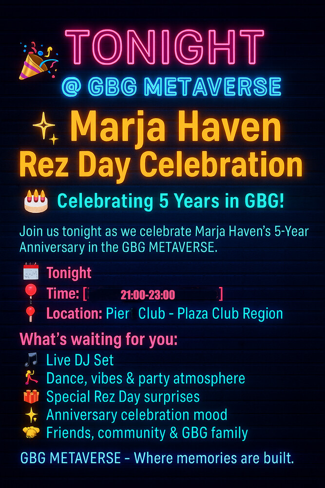 ![]() TONIGHT @ GBG METAVERSE ✨ Marja Haven – Rez Day Celebration ? Celebrating 5 Years in GBG!
