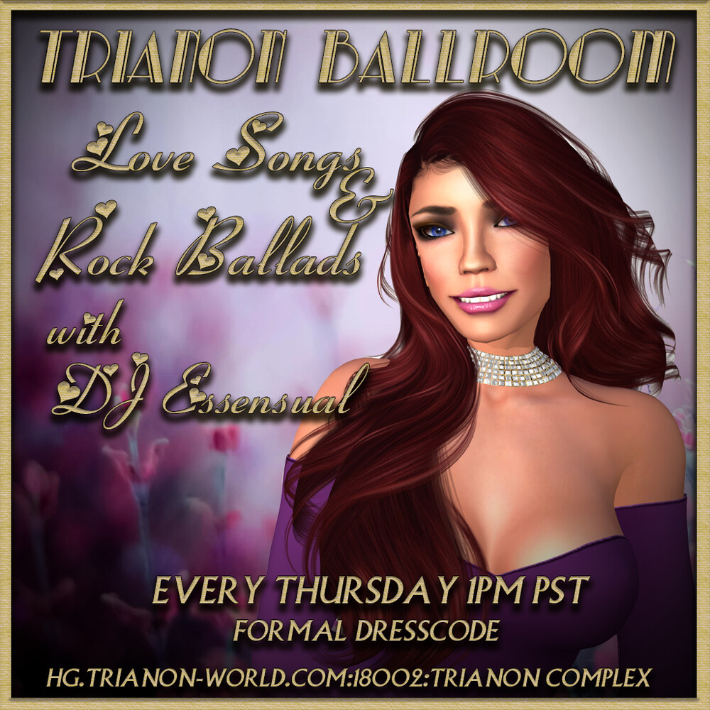 Every Thursday at 1:00pm PT, DJ Essensual plays some of the best love songs and rock ballads at Trianon's Ballroom Open Sim come with your partner or enjoy dancing with the unique to Trianon NPC dancers http://alternatemetaverse.com:8002:Trianon