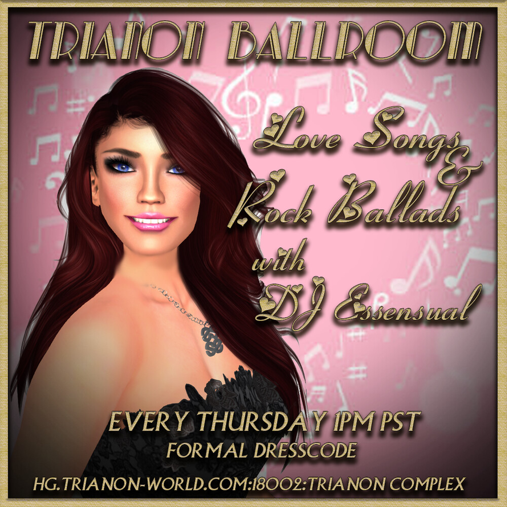 Every Thursday at 1:00pm PT, DJ Essensual plays some of the best love songs and rock ballads at Trianon's Ballroom Open Sim come with your partner or enjoy dancing with the unique to Trianon NPC dancers http://alternatemetaverse.com:8002:Trianon