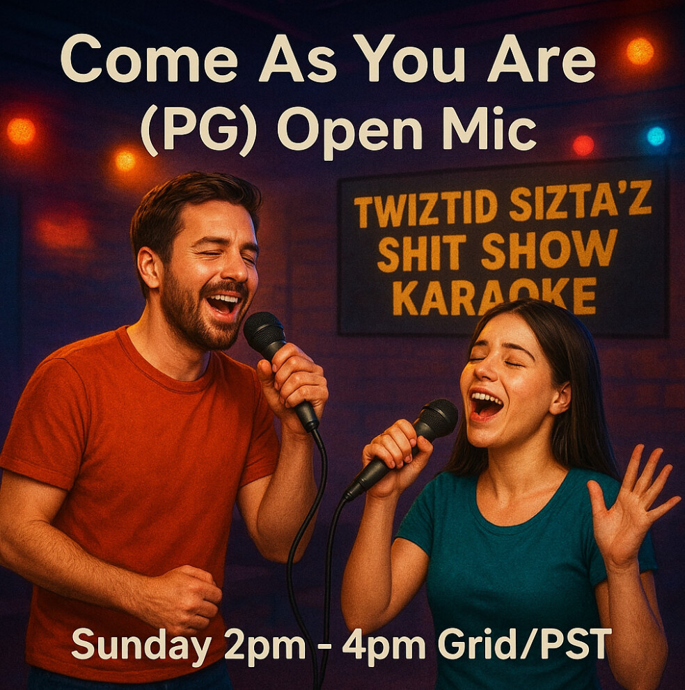 *~* Sunday's 2pm -4pm Grid/PST*~* Genre: OPEN-MIC (comedians, story tellers, singers) Attire: COME AS YOU ARE (PG) Perfection isn't required. Sing on our House Stream or sing in Local using your voice. Not comfy singin'... sit back, relax, & listen or dance. This week we'll be singing at The Velvet Parlour No.9 hop://hg.twiztidtimezgrid.com:8602/Wicked%20Waves/575/215/23 TuneIn from anywhere: http://198.245.61.188:8000 1 0 |