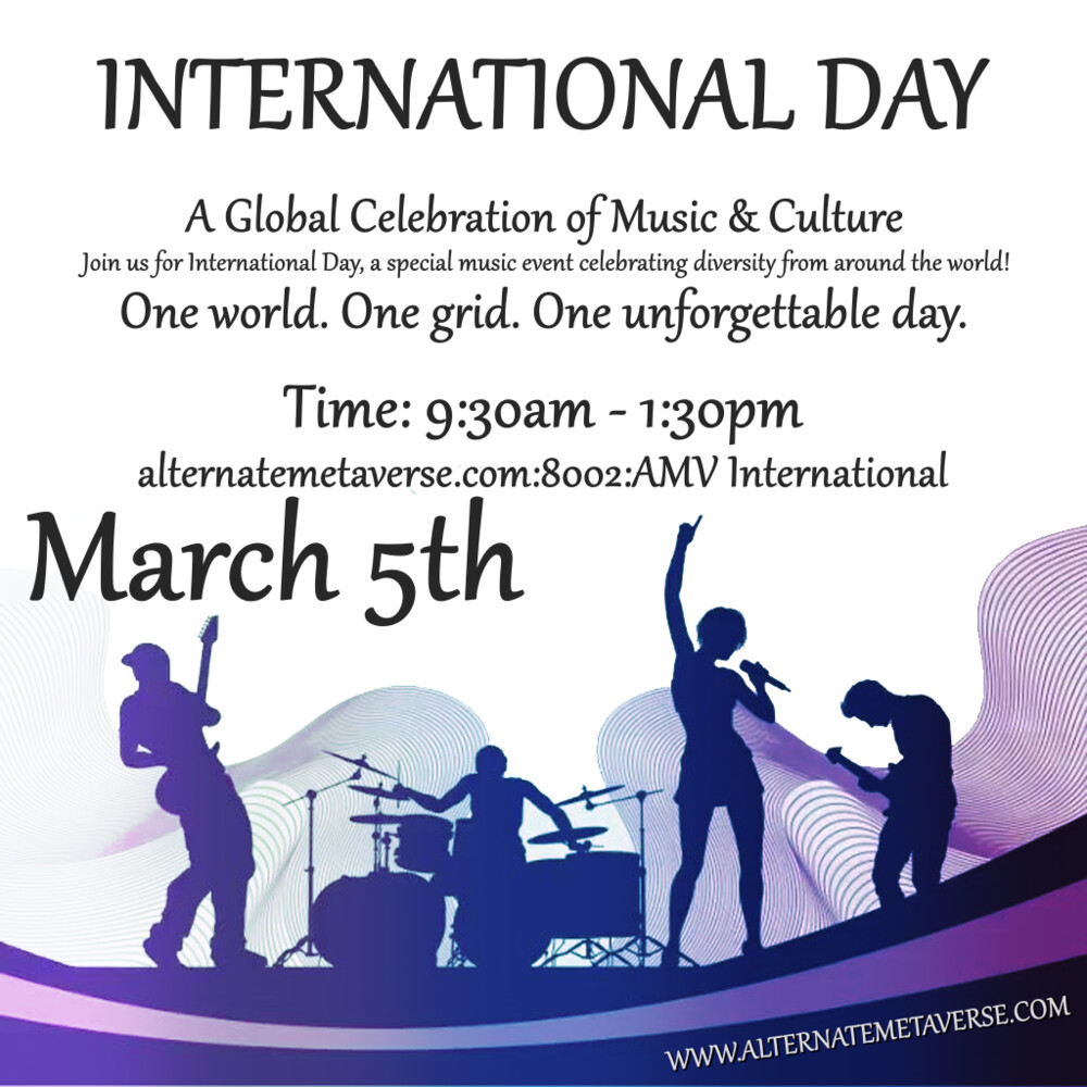 Grid Co-owner Cataplexia Numbers was thinking of a way to bring together the residents of various countries that are members of AMV and have them not only get to know each other better but to also interact on a united level, celebrating the music of various countries together. To celebrate the various differences within a multi-cultural grid as opposed to having those differences as a means of dividing....International day was born in OpenSim as March 7th 2024 and to be continued annually during the first week of March.