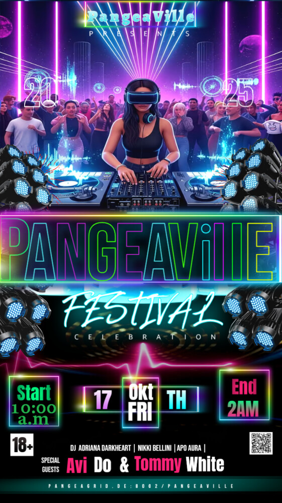 ★ ᵂᴴᴼ ⇘ Thommy White, AdrianaDarkheart, Nikki Bellini, Apo Aura ★ ᵂᴴᴬᵀ ⇘ ♬ Electronic Music ? ★ ᵂᴴᴱᴺ ⇘ 17.10.2025 - @ 10. GridTime ? ★ ᵂᴵᵀᴴ ⇘ ~OpenSim-All FuN in One ★ ᵂᴴᴼ ⇘ hop://pangeagrid.de:8002/PangeaVille 0 0 |