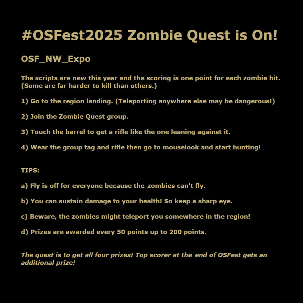 OSFest Day15 Zombie QuestOSF_NW_Expo 1 years ago | 2024-10-18 20:00 SLTOSFest 2024 is happening at the OSFest Grid October 4-20, 2024 from 9am to 9 pm every day! The is your OSFest celebrating the creative community across the HG. Events are planned in all regions while performances are in the OSF_Event region. Bring your friends. The bigger the party is, the more fun to be had!