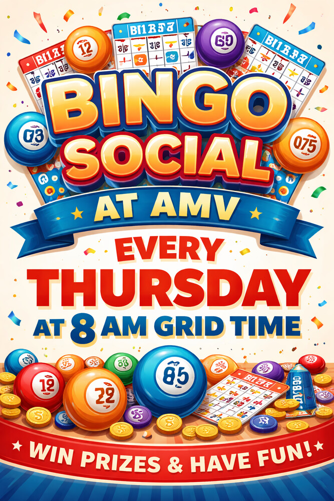 You like to have some fun and you like to play bingo, this is the time to do so Host or Hostess calling the numbers giving you points easy to play Come and join us every thursday at 8 am grid time 0 0 |