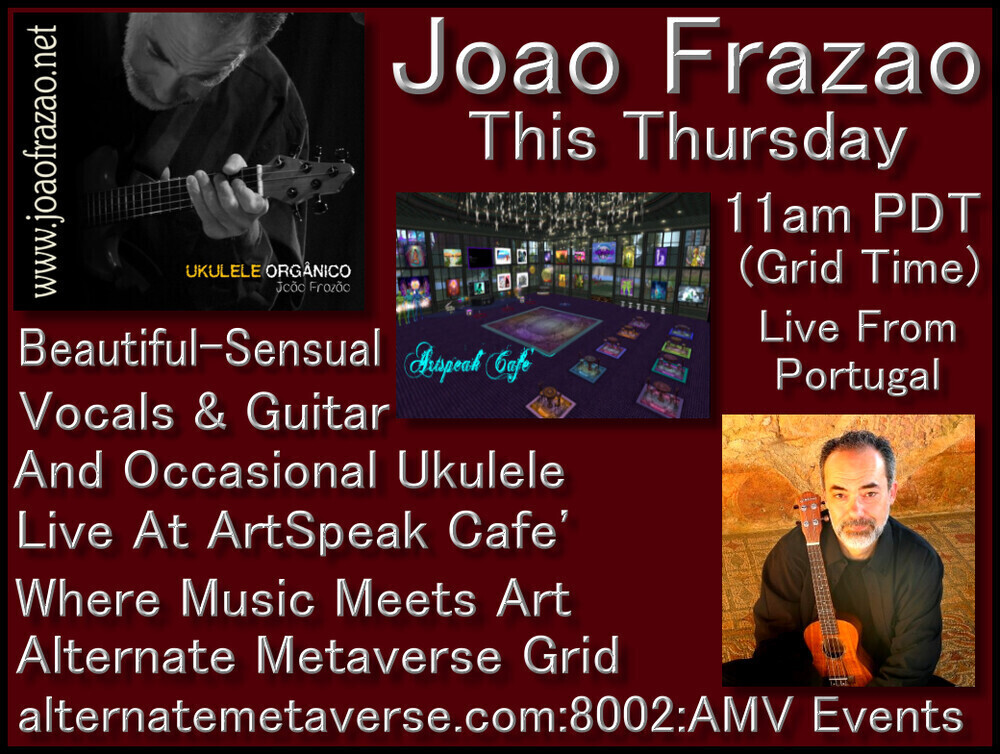 Joao Frazao Live @ The Party StageAlternate Metaverse in 14 days | 2026-01-15 11:00 SLTJoao Frazao Live Beautiful, Sensual Guitar & Vocals and occasional Ukulele!! Thursday @ 11 am,(Every other Thursday). He has spent the last 25 years playing, recording & promoting Portuguese folk music all over the world, his own shows & as a session musician for several main stream Portuguese artists.