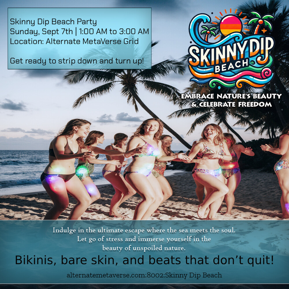 Skinny Dip Beach Party & DJ YANASkinny Dip Beach 2 months ago | 2025-09-07 01:00 SLTSunday, Sept 7th | 1:00 AM to 3:00 AM Location: Alternate MetaVerse Grid Taxi; hop://alternatemetaverse.com:8002/Skinny%20Dip%20Beach/179... Get ready to strip down and turn up. Live DEEJAY' s will take you on a two-hour ride of high-energy beats. Bikinis, bare skin, and beats that don’t quit. This is the night to break loose, own your freedom, and dance like nothing’s off-limits. Be there, or hear about it later. 0 0 |